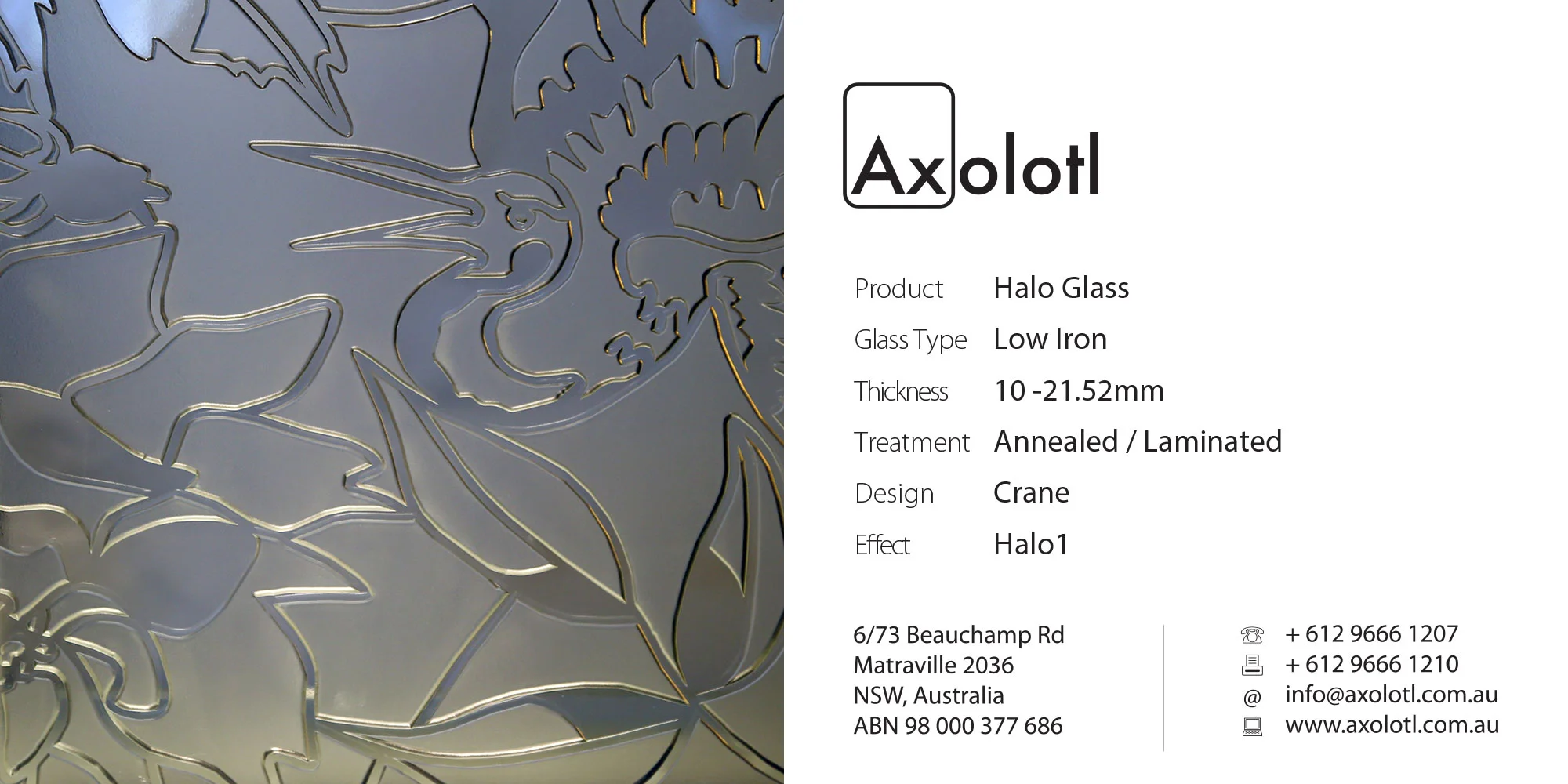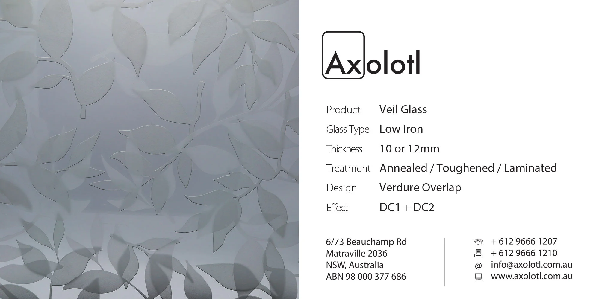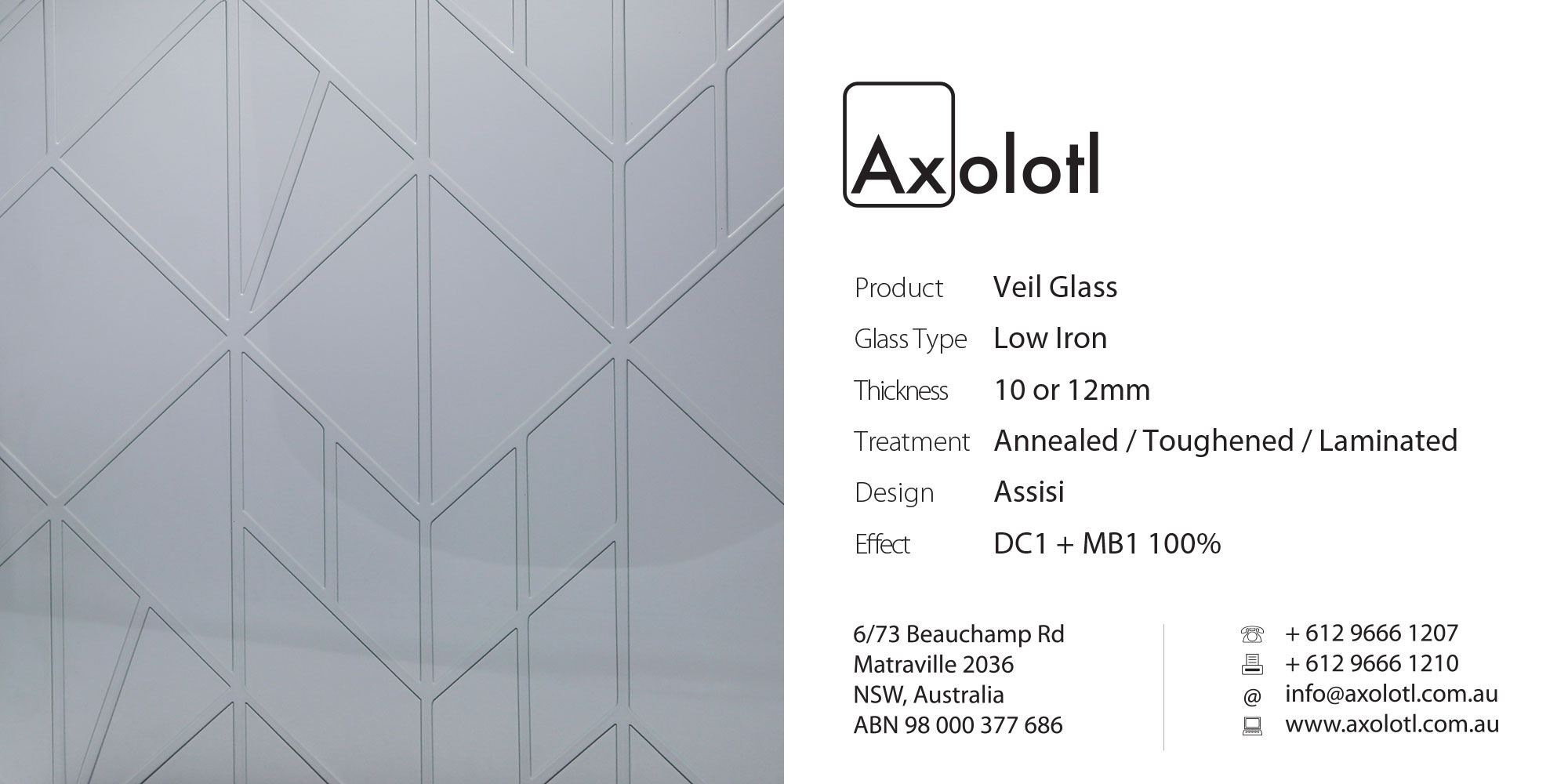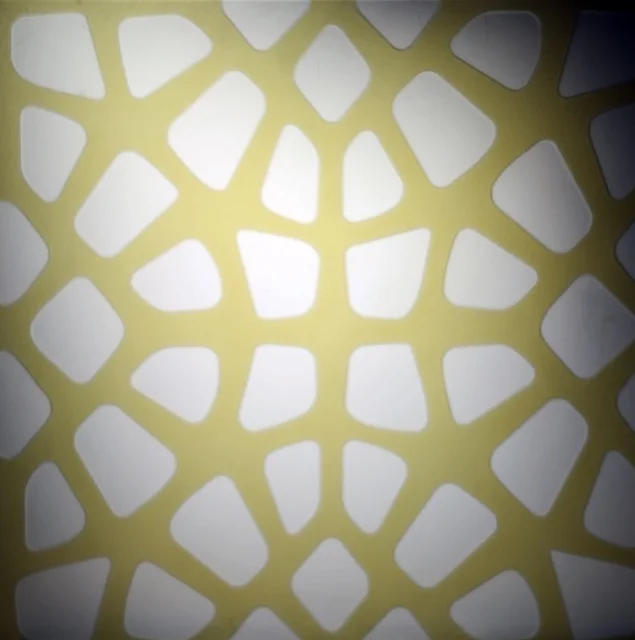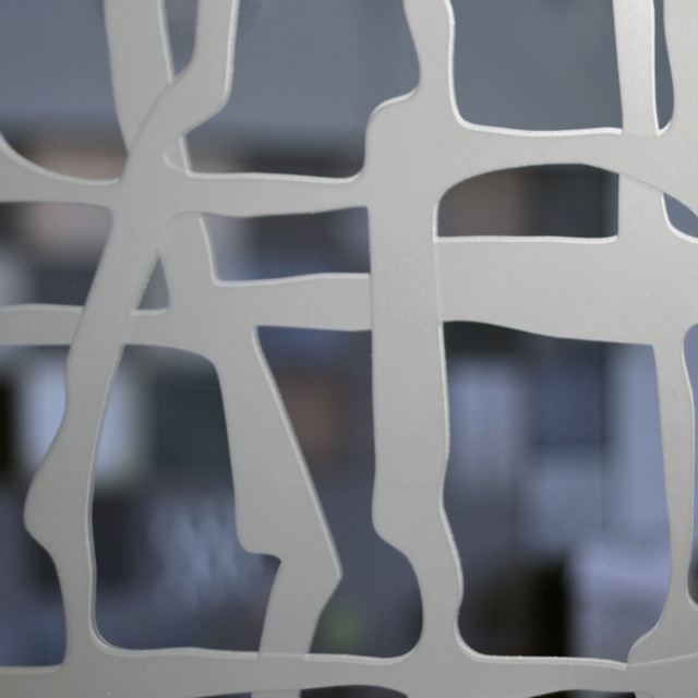 A striking effect can be achieved through Veil which involves etching a design to one or both faces. Varying degrees of visual obscurity can be achieved, depending on the chosen pattern and scale, providing varying degrees of privacy.