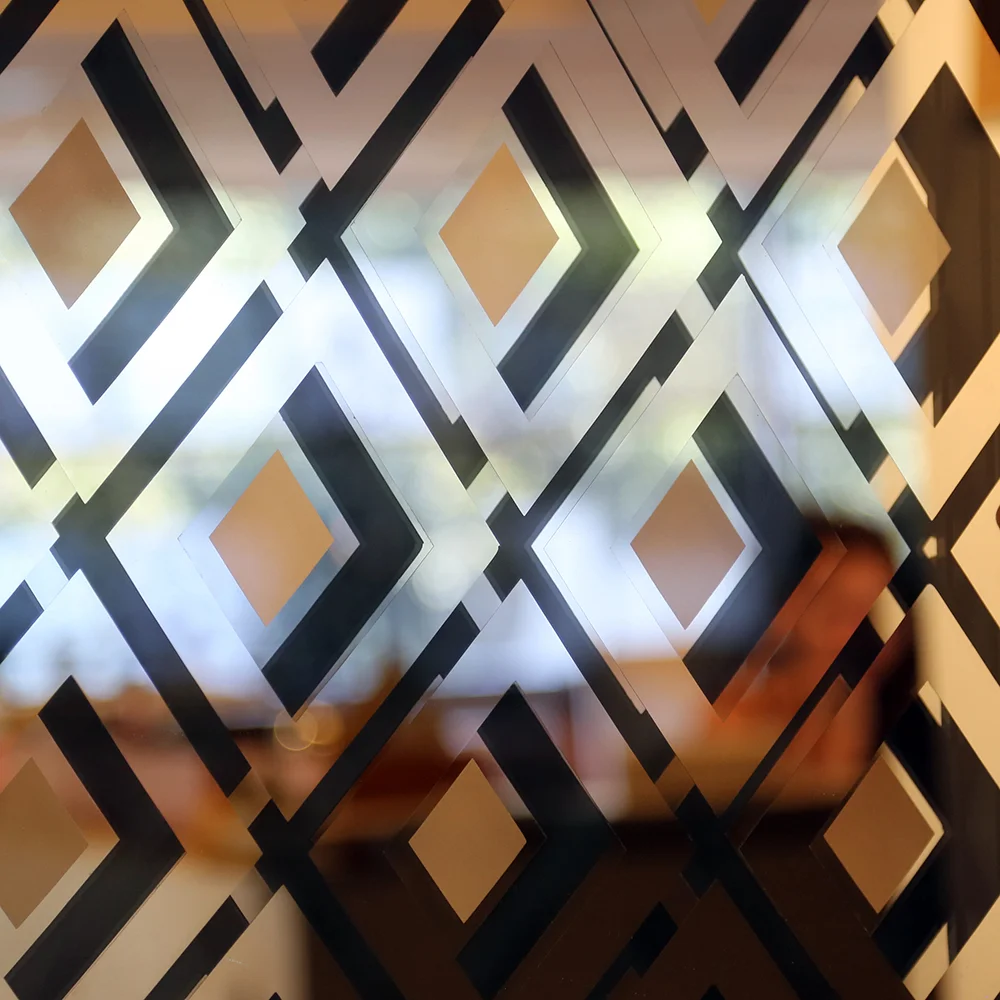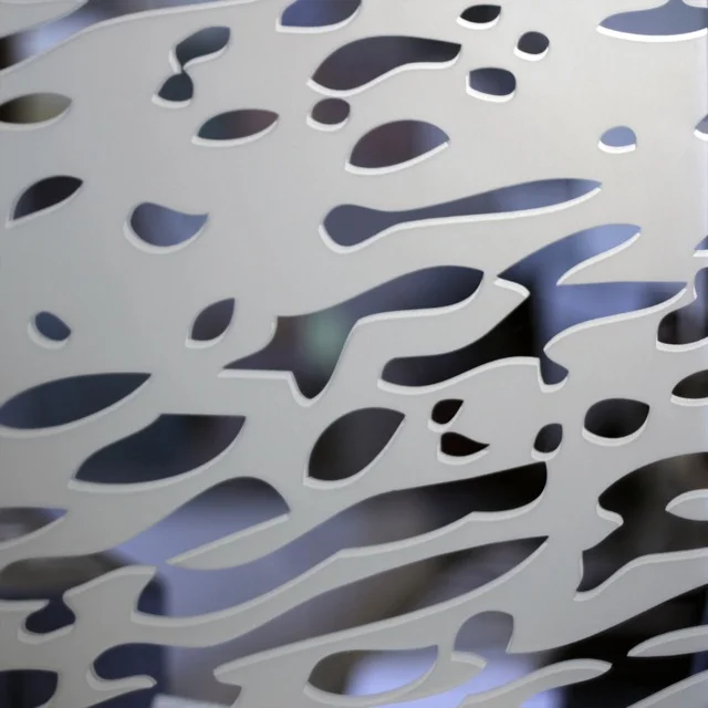 The mirror design applied to the front panel seemingly floats yet disappears in certain line of sight creating visual excitement. A range of standard or custom patterns and designs can be achieved on either panel.