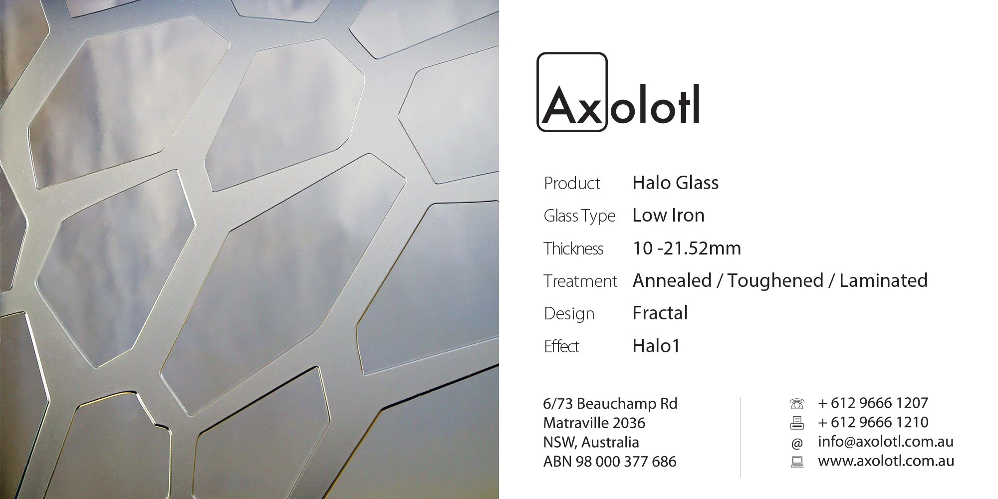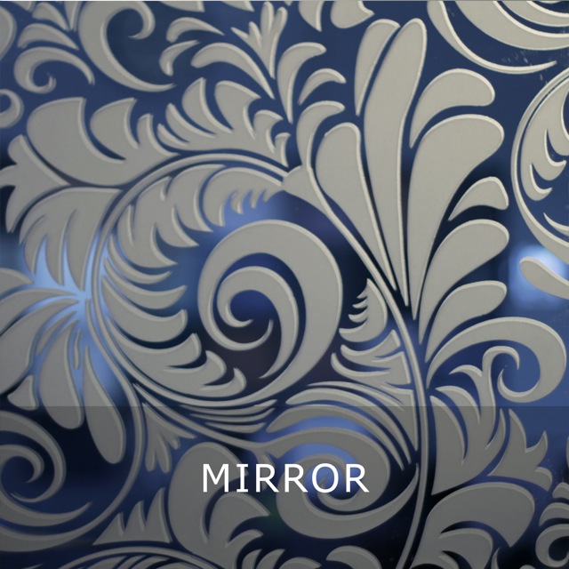 Mirror is a single-presentation face glass product. Mirror features a mixture of a matt-blasted finish to the front face, and areas that have been left clear to allow the highly reflective rear surface create various patterns in the glass. A standard or custom range of patterns is available.