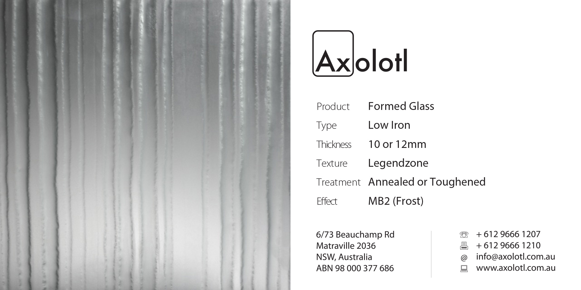 Formed is a range of textured glass where one face has been formed over a pattern or mould to create a unique finish to every panel of glass. Formed is the ideal product to apply transparent coloured finishes and a wonderful medium for corporate logos and text. The above samples are shown in Low Iron glass, however are also available in Bronze, Grey, Clear Float and Green coloured glass.