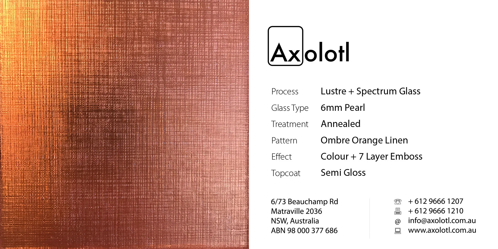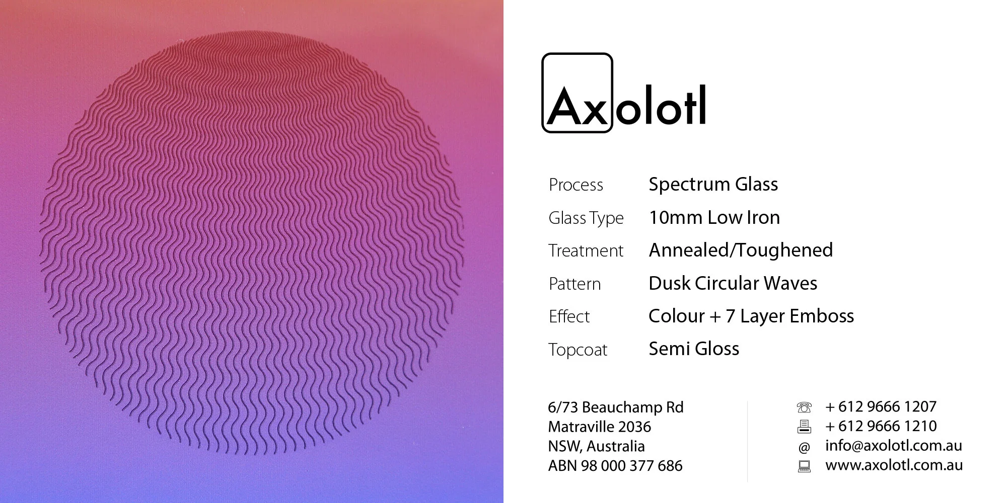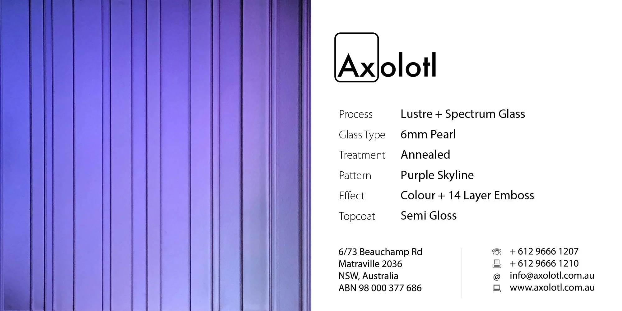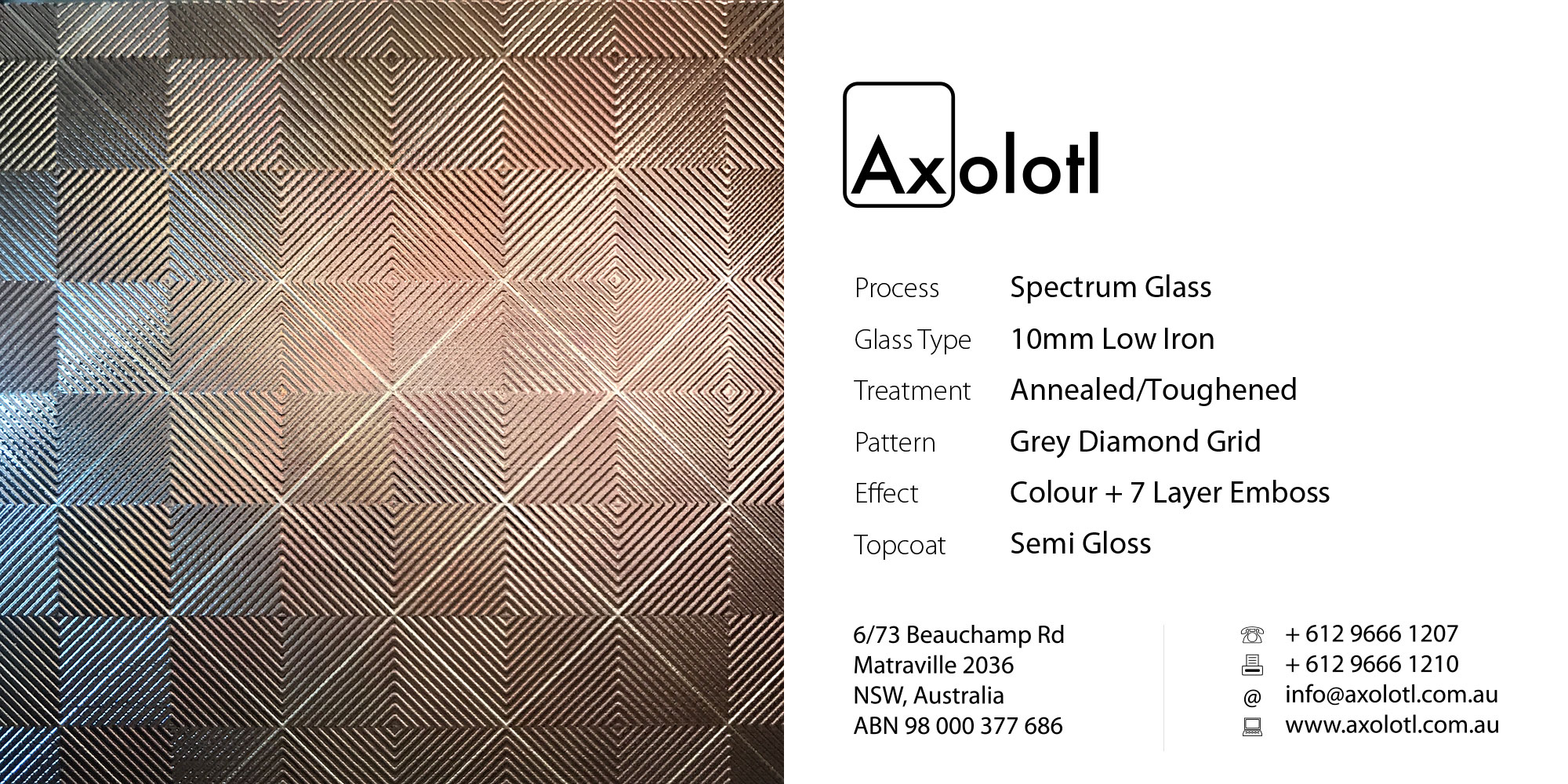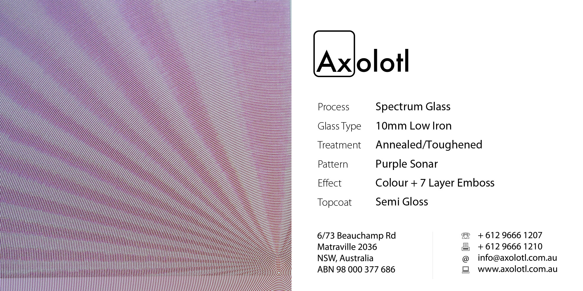 Lustre Spectrum is typically available as 6mm thick annealed glass, however can be produced in different thicknesses or as toughened float if required.