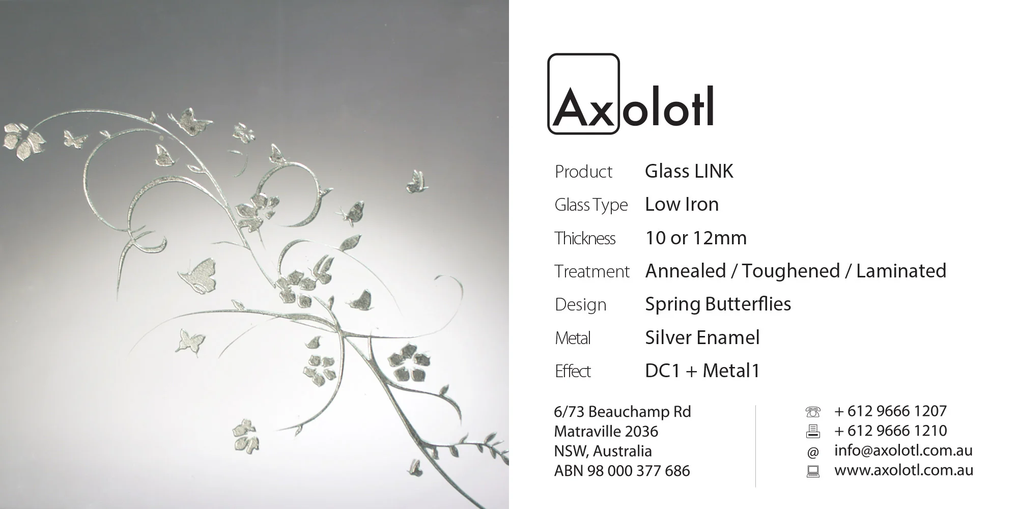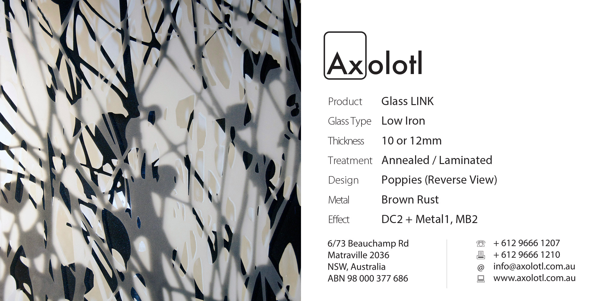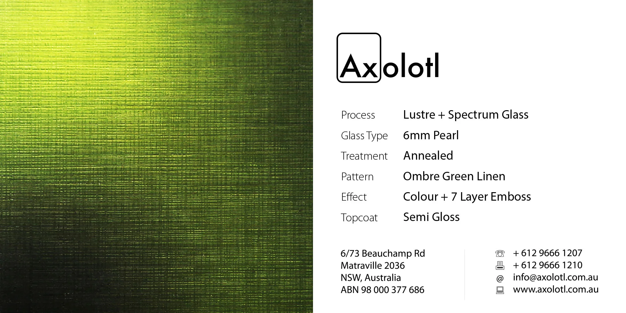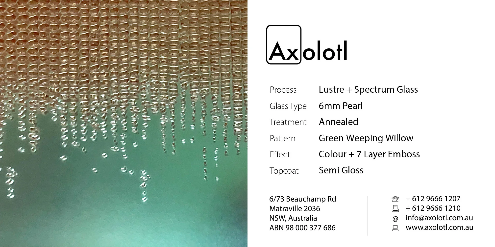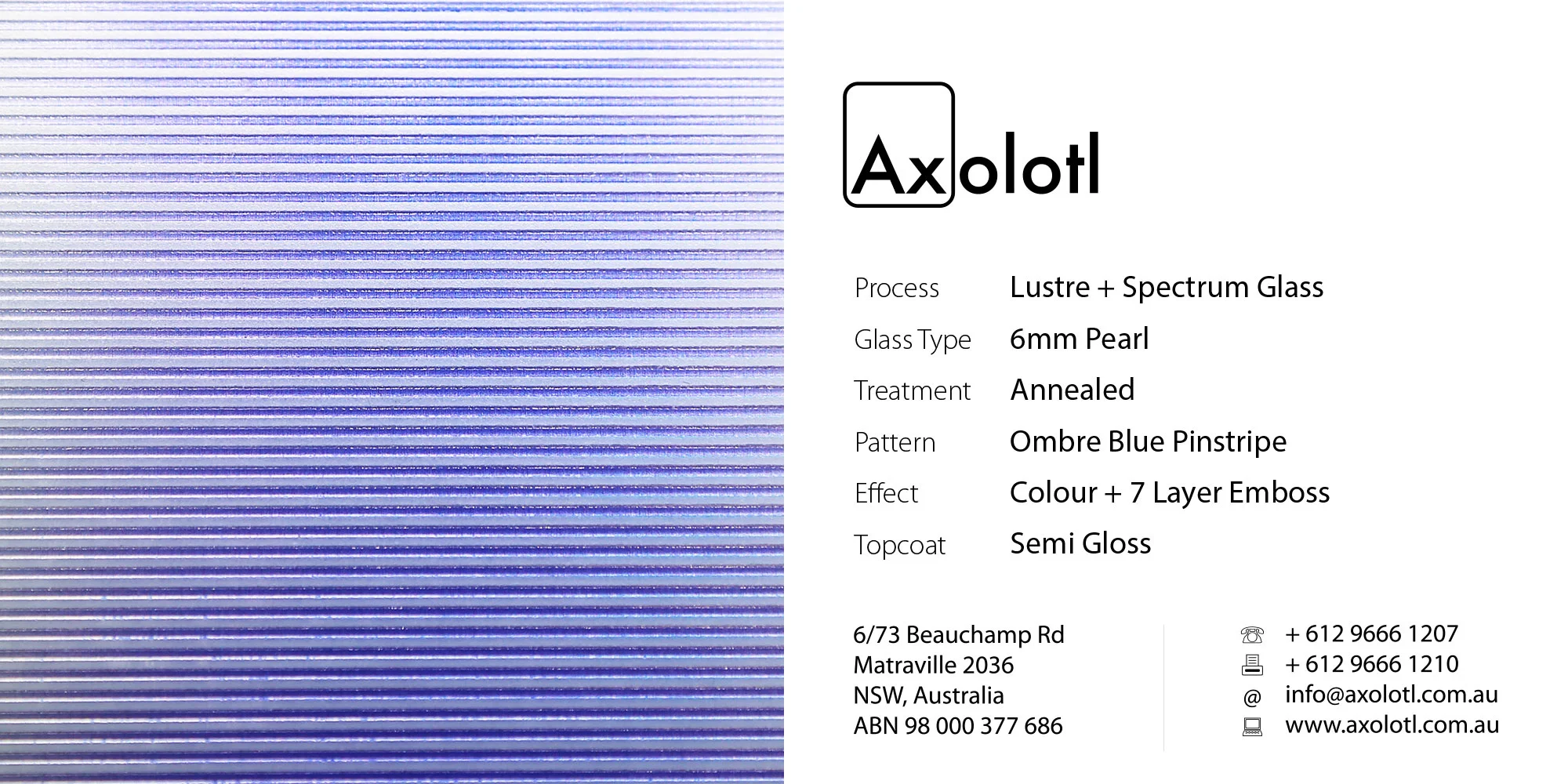 Lustre Spectrum is typically available as 6mm thick annealed glass, however can be produced in different thicknesses or as toughened float if required.