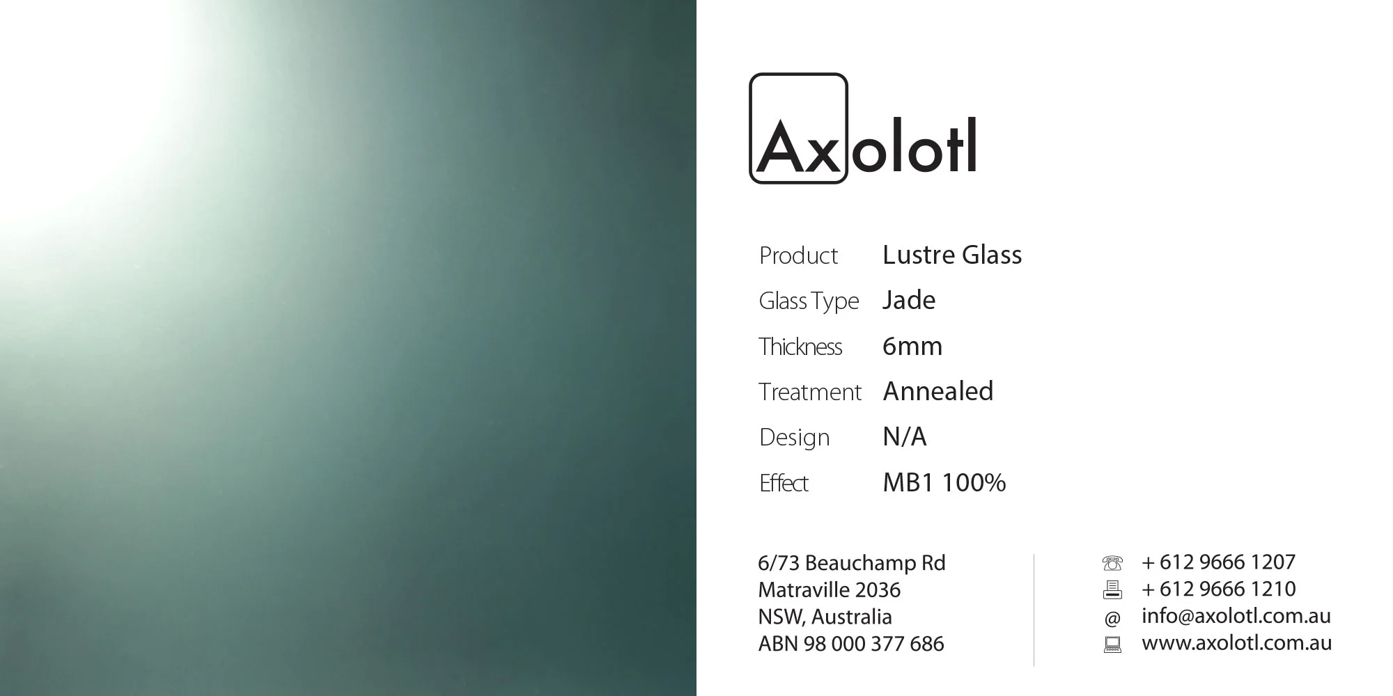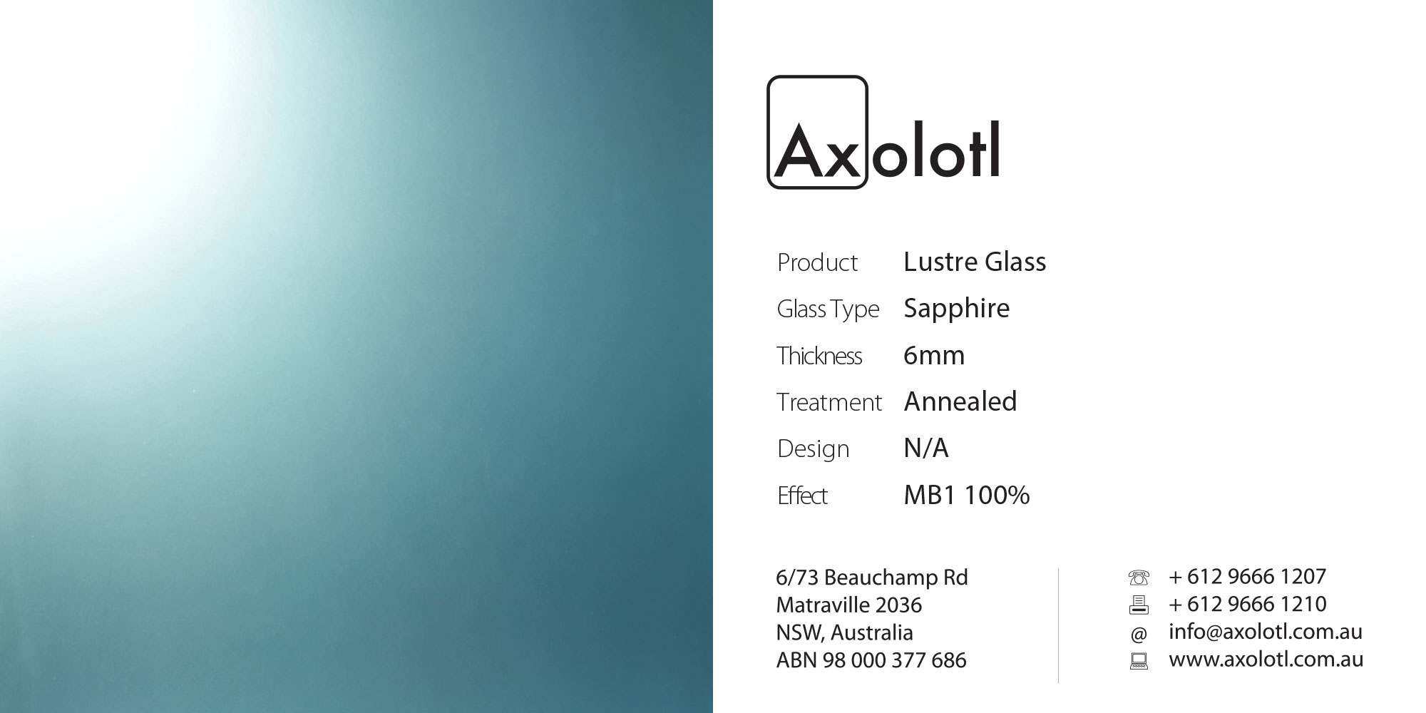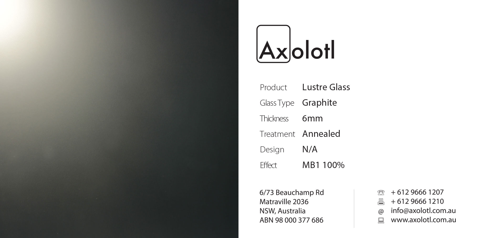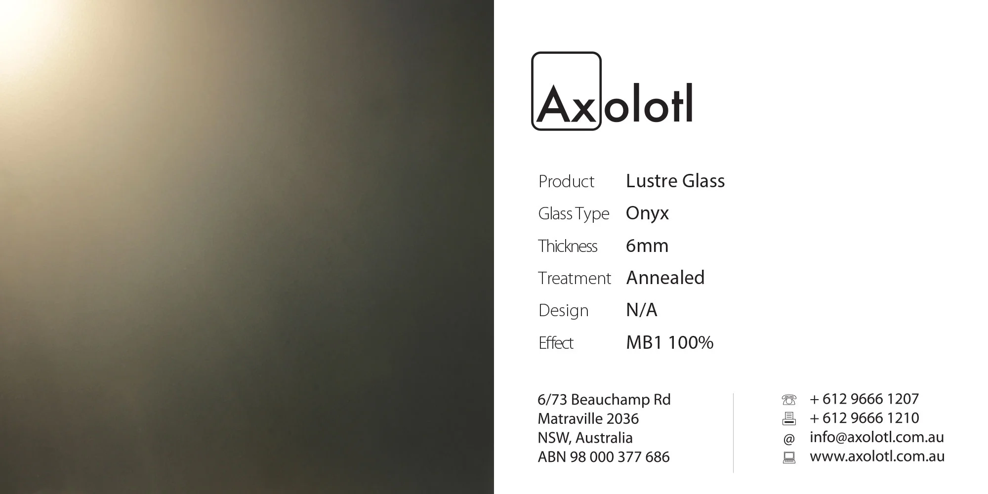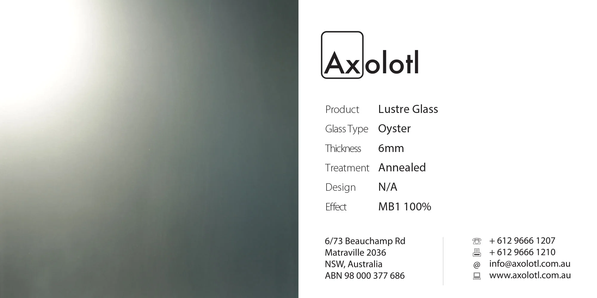 Lustre is a single-presentation face glass product. Lustre has a matt-blasted finish applied to the front face to give a satin-like finish. The rear face has an applied highly reflective coating that can be glue fixed to any substrate using a neutral cure silicon.