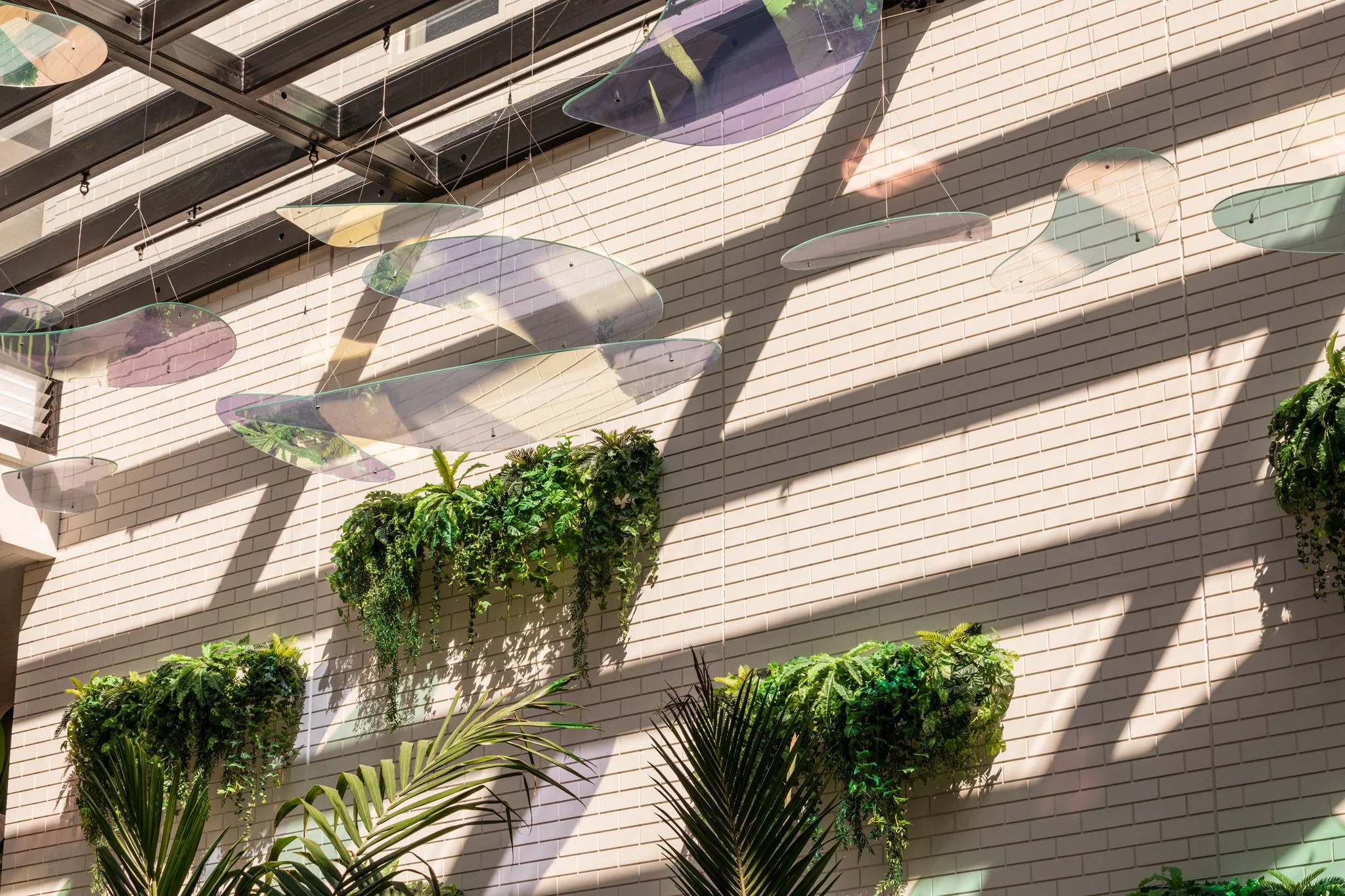 With a focus on delivering unique and captivating pieces, AAP partnered closely with acclaimed designer Adam Goodrum and Broached to craft "Whorl", an inspiring dichroic glass mobile. This was a central expression of the Broached curatorial focus on flowers. Hanging elegantly in the hotel's atrium space that connects the heritage and new wing of the complex, the installation comprises 48 handcrafted glass panels, each one meticulously shaped and polished. The mobile's dichroic glass splashes coloured light throughout the space, bathing the space in a mesmerising glow.
